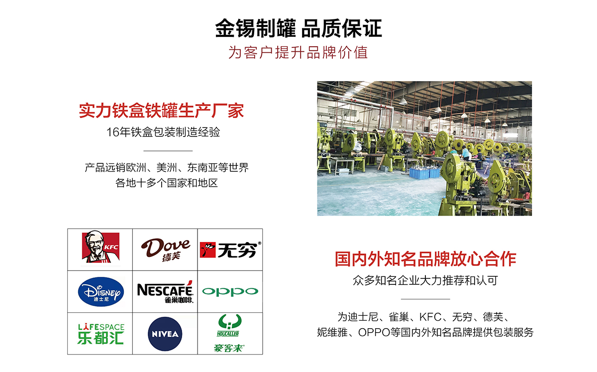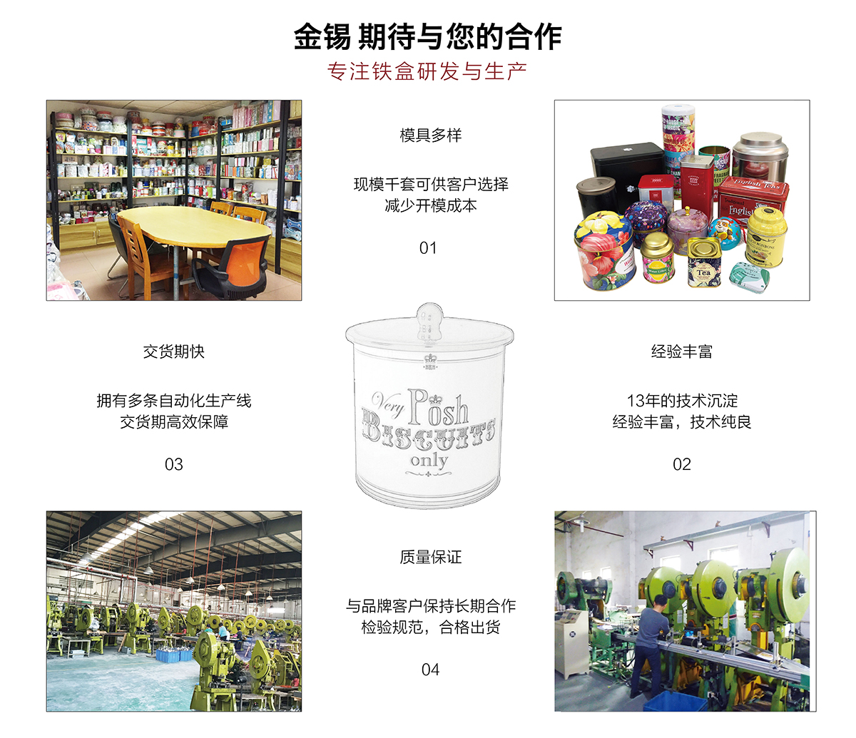 廣州市金錫五金制品有限公司成立于2016年,是已有13年生產(chǎn)經(jīng)驗(yàn)的實(shí)力廠家。我廠是專(zhuān)業(yè)定制優(yōu)良馬口鐵盒、鐵罐、禮品盒、茶葉罐、月餅盒等金屬鐵盒包裝的制罐企業(yè),我們擁有超過(guò)6000平方米的標(biāo)準(zhǔn)現(xiàn)代化廠房及八條生產(chǎn)線(xiàn)。公司集產(chǎn)品研發(fā)、設(shè)計(jì)、生產(chǎn)、銷(xiāo)售于一體,技術(shù)優(yōu)良,實(shí)力雄厚。通過(guò)十多年的制罐經(jīng)驗(yàn),我們擁有專(zhuān)業(yè)的技術(shù)團(tuán)隊(duì),嚴(yán)格的作業(yè)流程、完整的品質(zhì)保障體系、完善的銷(xiāo)售以及售后服務(wù)系統(tǒng)。